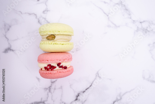 Macarons on a colored background, French cookies. Gift for March 8, International Women's Day, Valentine's Day. Sweets for coffee and tea