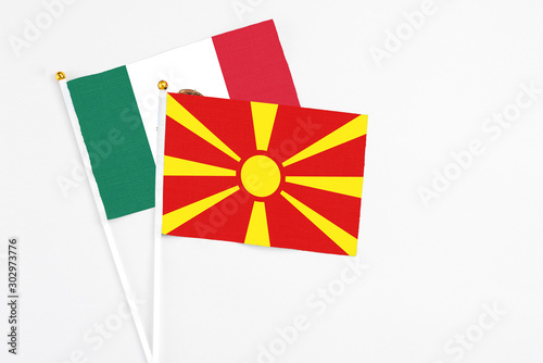 Macedonia and Mexico stick flags on white background. High quality fabric, miniature national flag. Peaceful global concept.White floor for copy space.