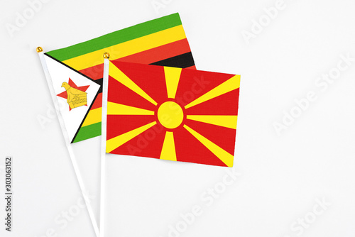 Macedonia and Zimbabwe stick flags on white background. High quality fabric, miniature national flag. Peaceful global concept.White floor for copy space.