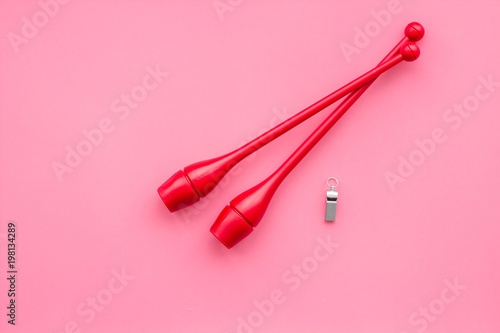 Maces for rhythmic gymnastics on pink background top view copy space