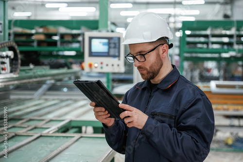 Machine behind, holding notepad. Factory worker is indoors with hard hat