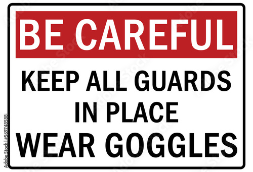 machine guarding sign and labels keep all guard in place, wear goggles