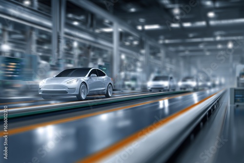 Machines on the conveyor, futuristic automotive factory. Generative AI