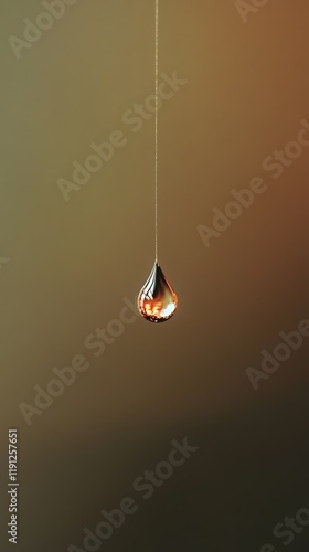 Macro close up of a single water droplet hanging on a thin string, reflecting orange light against a blurred dark background, creating a mesmerizing visual