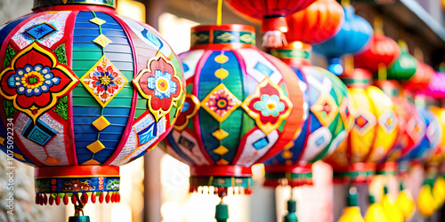 Macro Close up of Seollal Traditional Lanterns Intricate Designs & Vibrant Colors Symbolizing Light Hope Festive Celebration Ample Copy Space Ideal for Photo Stock Concept