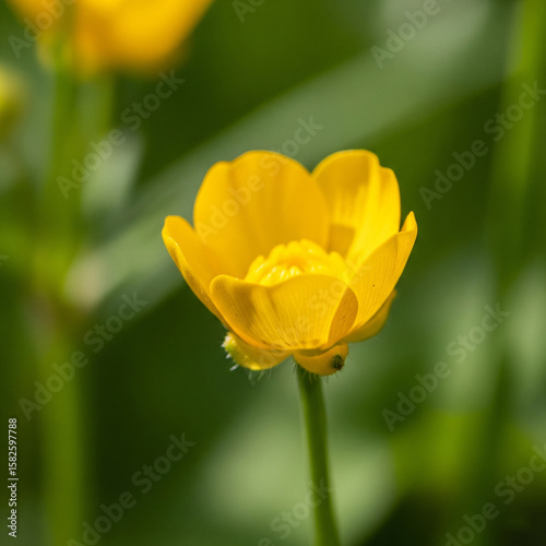 Macro close-up of a bright yellow buttercup, sharply focused against a soft, dreamy green bokeh background in gentle, diffused light.