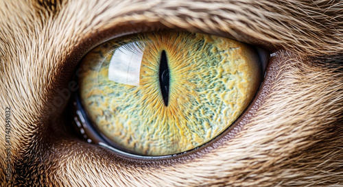 Macro close-up of a cat's vibrant yellow-green eye. Detailed feline iris and vertical pupil, showcasing intricate texture.