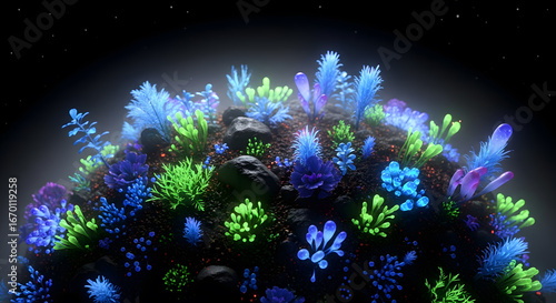 Macro Close-Up of a Planet Covered with Glowing Bioluminescent Alien Vegetation