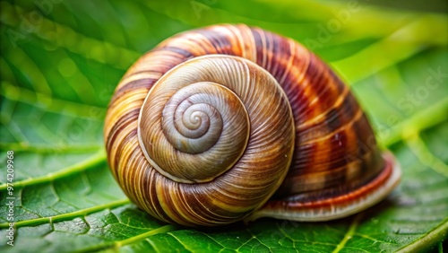 Macro close-up of a spiral-shaped, brownish-gray snail shell with swirling patterns, ridges, and tiny imperfections,