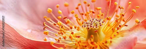 Macro close-up of a yellow pistil and stamens in focus on a fully bloomed rose flower, surrounded by soft pink petals, enhancing the beauty of ornamental garden blossoms.