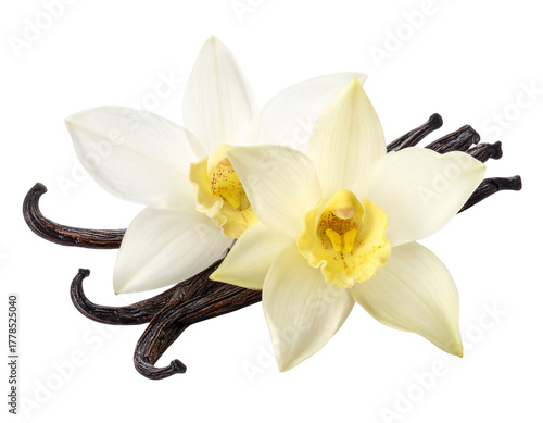 Macro closeup of vanilla pods and white orchid flower with yellow accents, highlighting the natural beauty of the blossom and leaf
