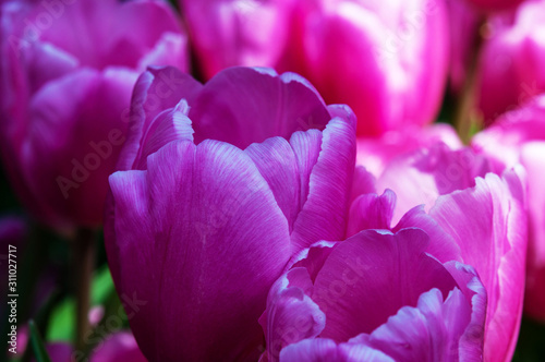 Macro closeup purple tulips flowers in the garden