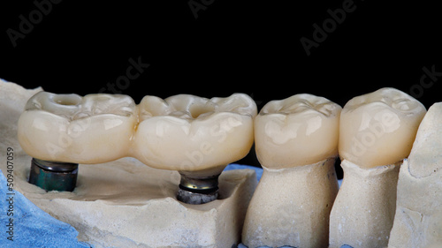 macro dental photo of a bridge and ceramic crowns with a relief of chewing teeth on a black background