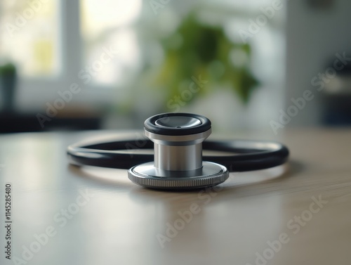 Macro Extreme closeup stock photo of a doctor s stethoscope with focus on brand and metal details