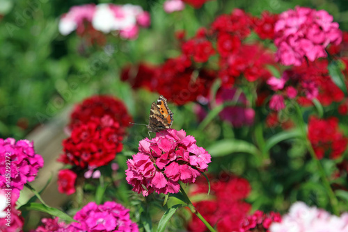 Macro image of a Small Tortoiseshell butterfly on a Sweet William flower, Derbyshire England