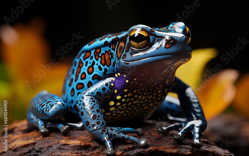 Macro lens portrait of a vibrant cobalt blue, orange poison dart frog