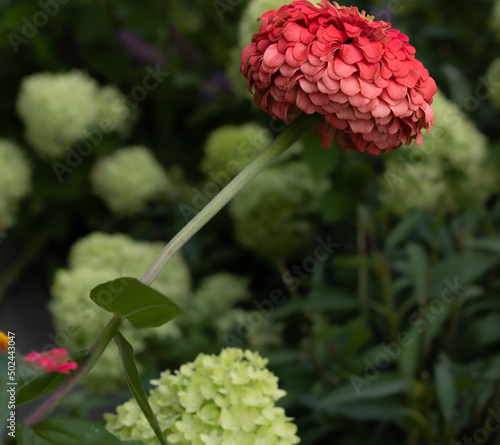 Macro of a giant, beautiful coral colored zinnia elegans, multi petaled in a midwest garden with a dark background.
