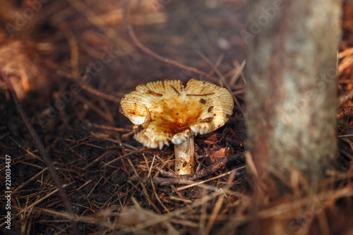 Macro of beautiful small red yellow russula mushroom in autumn forest grass moss. View from top above. Fungus boletus in wood. Sunny day in country rural are.