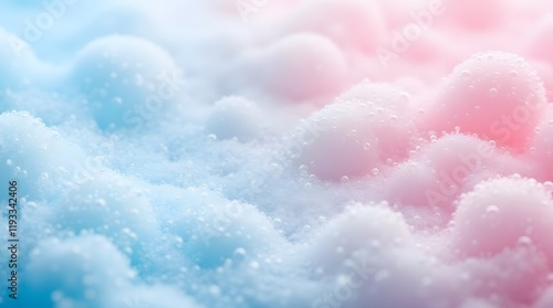 Macro photo of bubbles in water. Pink and blue background with foam made of soap, shampoo, lotion, detergent. Banner with copy space for laundry and cleaning services, beauty, skin care, spa, concept
