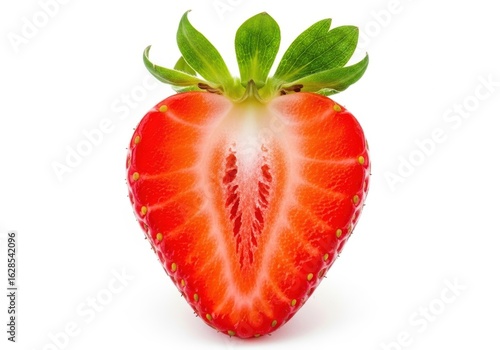 Macro photograph of a halved ripe red strawberry with green leaves fruit