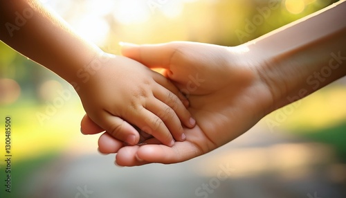 Macro photograph of a mother’s hand gently holding a child’s hand, capturing the tenderness, warmth, and connection between them with soft lighting and detailed textures of the skin.