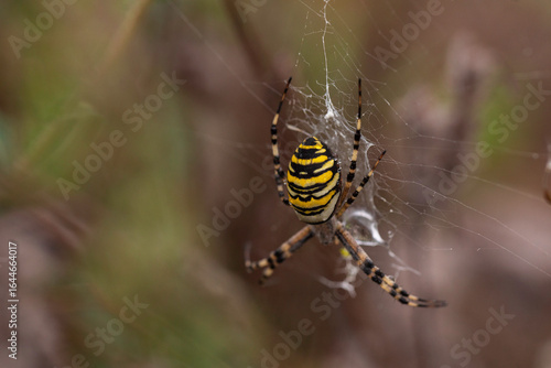 Macro photograph of a wasp spider (Argiope bruennichi) resting in its web, showcasing vivid yellow and black striped abdomen, intricate silk patterns, and natural background in high detail