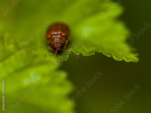 Macro photograph of insect life. Leaf beetle on plant, Close-up of a red spotted beetle. An Attelabidae on a leaf.