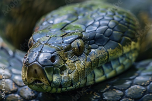 Macro photography capturing the intricate scales and eye of a green python in sharp detail
