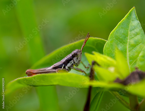 Macro photography of a black and brown grasshopper on a leaf. Captured in a garden near the colonial town of Villa de Leyva, in Colombia.