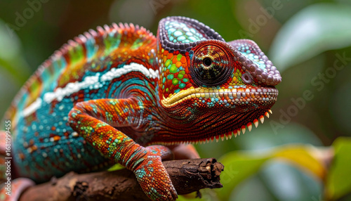 Macro photography of a Panther Chameleon perched on a branch, extreme closeup background