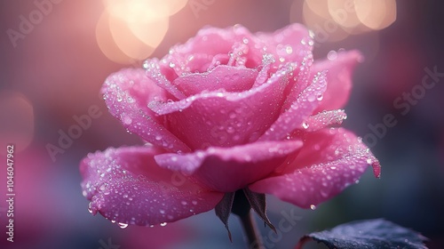 Macro photography of a pink rose, with each petal decorated with tiny, sparkling dew drops under a gentle glow