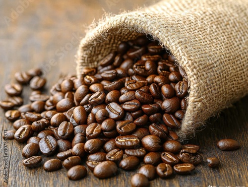 Macro Photography of Spilled Coffee Beans from Burlap Sack on Wood
