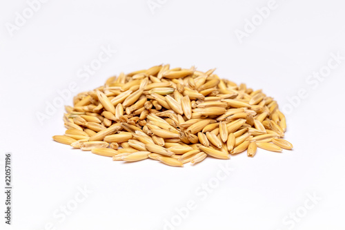 Macro pile of crude raw oat isolated at white background.