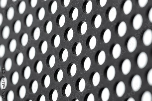 Macro shot of a black metal surface with round holes and white dots, isolated on a white background, selective focus.