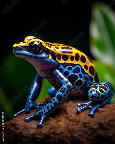 Macro shot of a colorful poison dart frog, vivid blue and yellow pattern, perched on a dark tropical leaf, concept of biodiversity