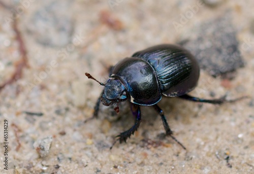 Macro shot of a common dung beetle walking in the sand