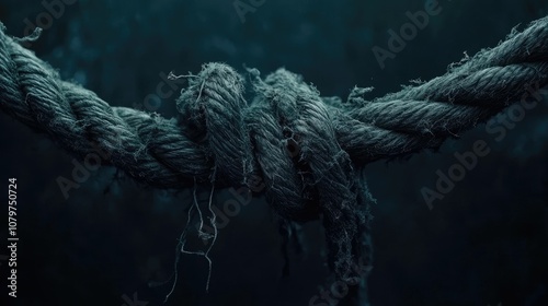 Macro shot of a frayed, thick rope with loose fibers against a deep, dark background, showcasing the worn texture and tactile details