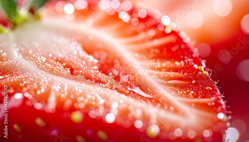 Macro shot of a freshly sliced strawberry with visible seeds and juice glistening on the surface