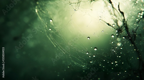Macro shot of a spider web with perfectly round dew drops clinging to its threads, illuminated softly by diffused light, muted green backdrop.