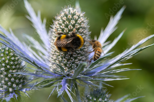 Macro shot of a white tailed bumblebee (bombus lucorum) pollinating an alpine sea holly (eryngium alpinium) flower