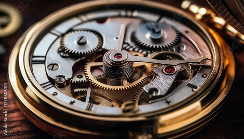 Macro shot of an antique pocket watch's inner gears, showcasing the fine mechanical craftsmanship, intricate detailing, and time-honored design that make it a timeless piece of engineering.