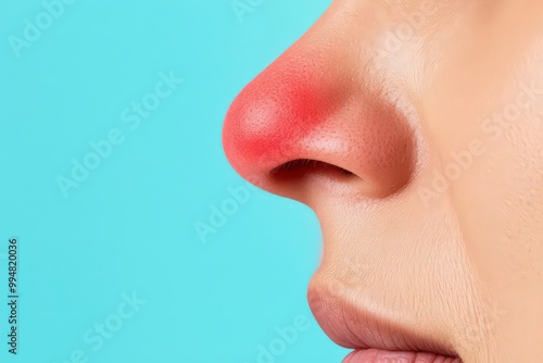 Macro shot of an irritated, red nose, pain, cold or allergy symptom