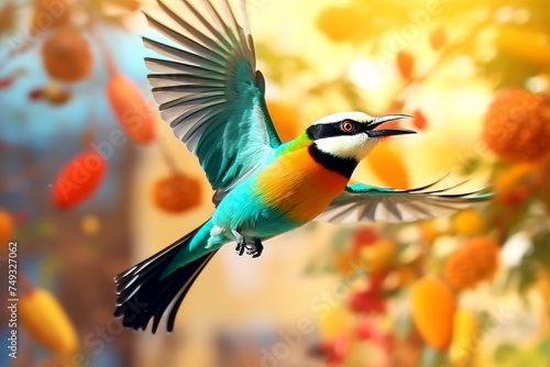 Macro shot of beautiful flying colorful tropical bird in the air on a blooming tree.