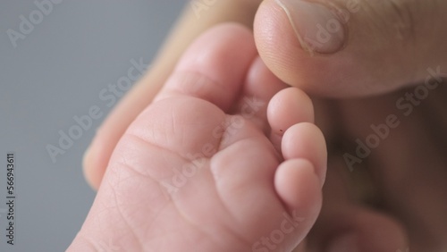 Macro shot of infants toe. Mother touching her small child's toes while he is asleep. Slow motion Video of mother touching her sons feet. Mum cares of her infant baby. Loving mothers care.