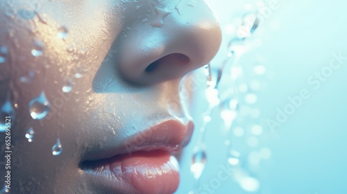 Macro shot of light skin young woman or girl face after washing with ater drops on light blue background for great skincare hydration and moisurizing