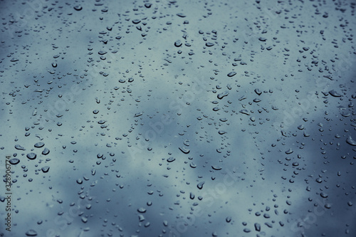 Macro shot of raindrops. Wet window. Bad weather and dark skies.