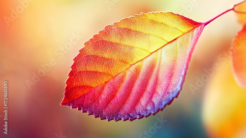 Macro Shot of Vibrant Autumn Leaf with Red and Yellow Hues Showing Detailed Texture Against Blurred Background
