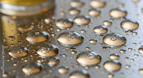 Macro shot of water droplets on shiny surface exhibiting reflections and refraction