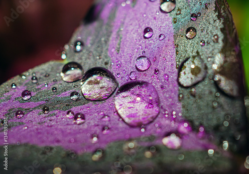 Macro shot of water drops on a purple leaf. Close-up shot of raindrops falling on a Purple Shamrock, Love Plant) in the rainy season.