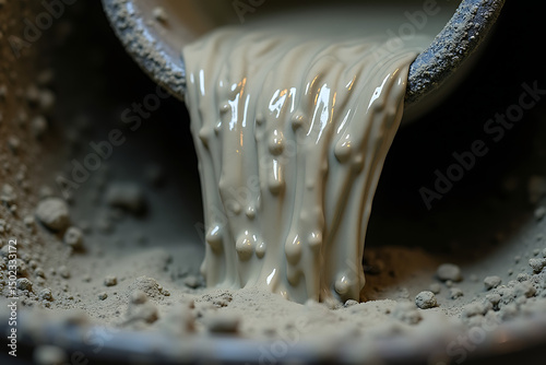 Macro Shot of Wet Concrete Pouring from a Chute, Capturing the Flowing Texture, Moist Surface, and Gritty Details as the Material Spreads Across the Formwork, AI-generated